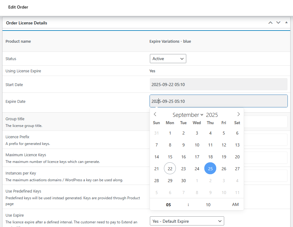 For convenient manual control the plugin adds a dedicated metabox to the admin order screen where expiration dates and license status can be reviewed and edited directly. This order management UI is described in detail here: Licence Keys Management – Admin Interface. From the metabox you can quickly adjust expiration windows, view activation counts and see related license information without leaving the order page.